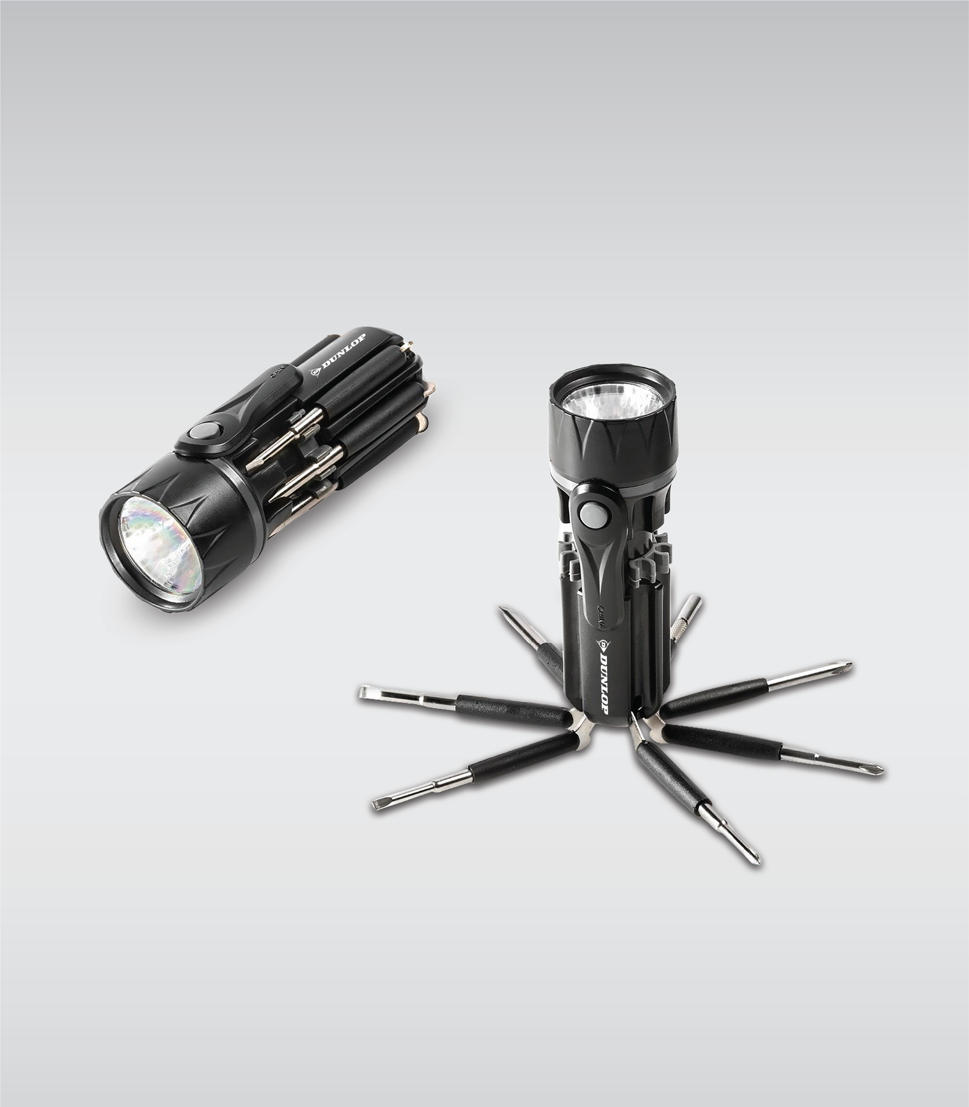 A handy promotional item for any event or occasion. Features 8 functions: on/off button- One click for flashlight, two clicks for tool light.: white LED light : 3 x AAA batteries included.